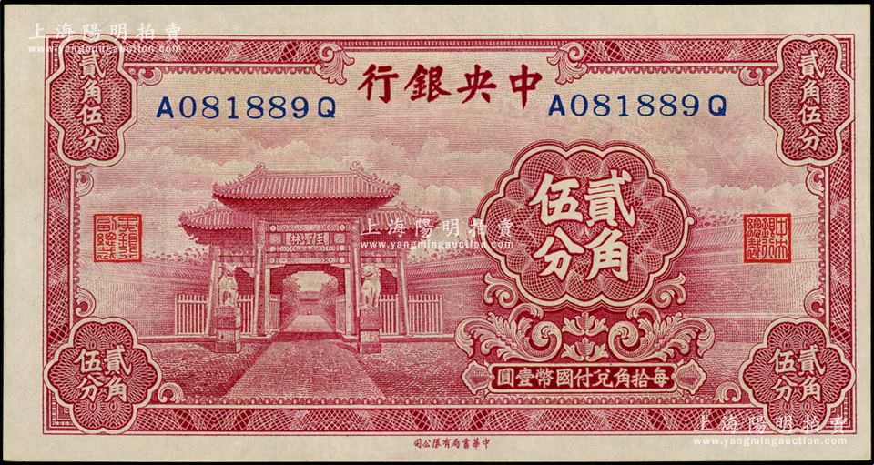 中央银行中华版至圣林贰角伍分,前后字轨,倒置号;源于前辈名家之遗藏,九八成新