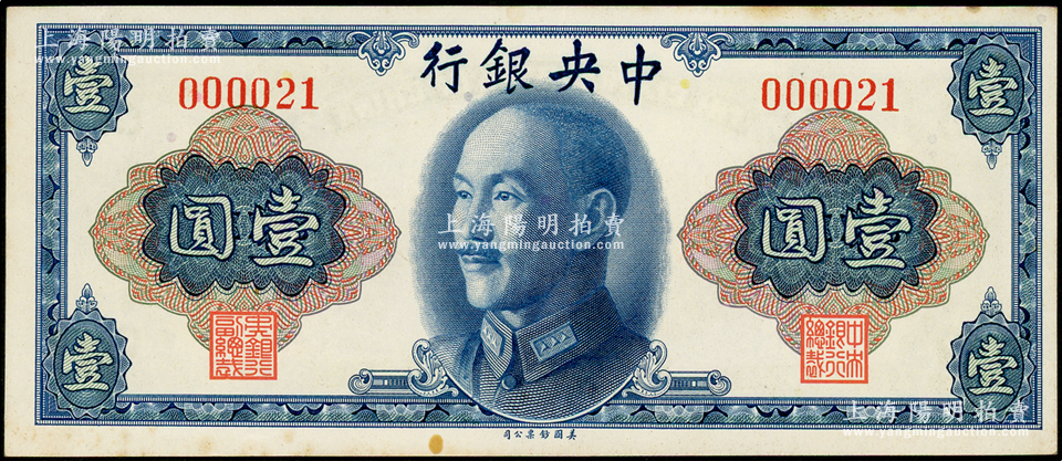 1945年中央银行金圆券美钞版壹圆,无字轨000021小号码;源于前辈名家之遗藏,未折九五成新