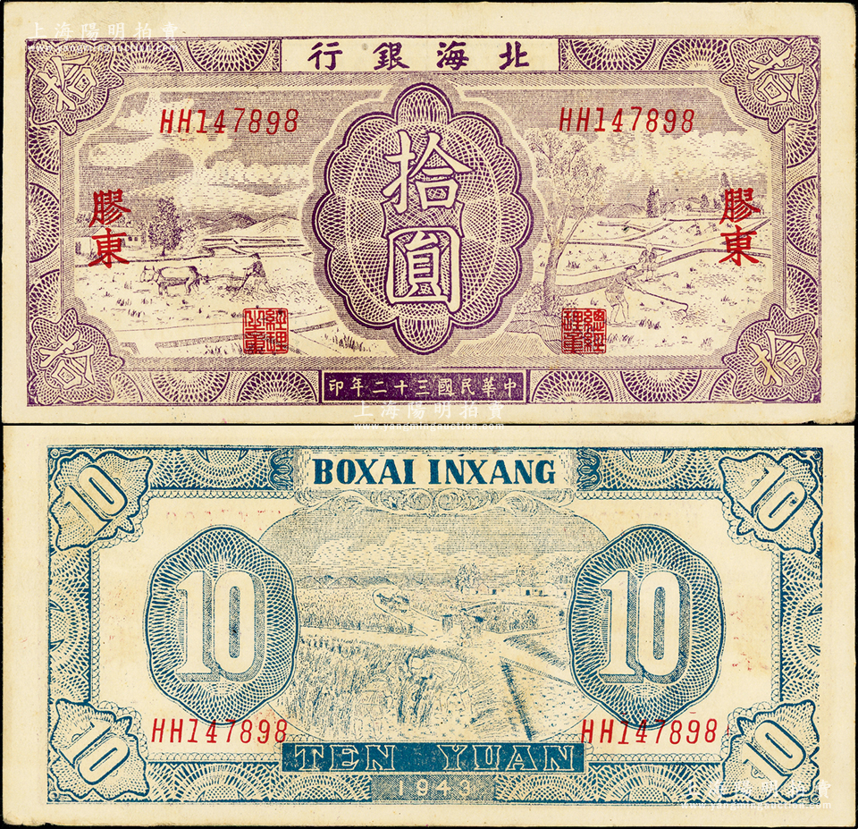 民国三十二年(1943年)北海银行紫色耕作图拾圆,胶东地名,英文HH双字轨,背印蓝色收割图;张勇先生藏品,原票八五成新(注:此种英文双字轨,目前共见有DD、EE、HH和JJ等多种,各券亦存在色差。)