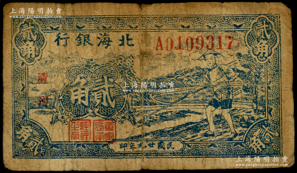 民国廿九年(1940年)北海银行蓝色农夫锄地图贰角,小字“清河”地名(上下宽距版),号码A01开头;张勇先生藏品,七成新