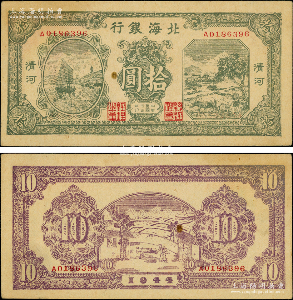 民国三十三年(1944年)北海银行绿色帆船与牛耕地图拾圆,清河地名,A字轨;张勇先生藏品,未折九成新