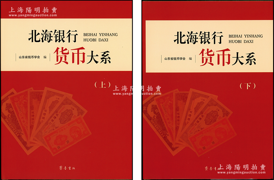 2015年山东省钱币学会编《北海银行货币大系》1套,上下册全彩色厚908页,内中收录北海银行流通票300余种版式、票样180余种,几乎囊括了目前已发现的所有北海币品种,且有大量文字介绍,图文并茂,属高质量之纸币书籍,品相全新完好,值得推介和重视