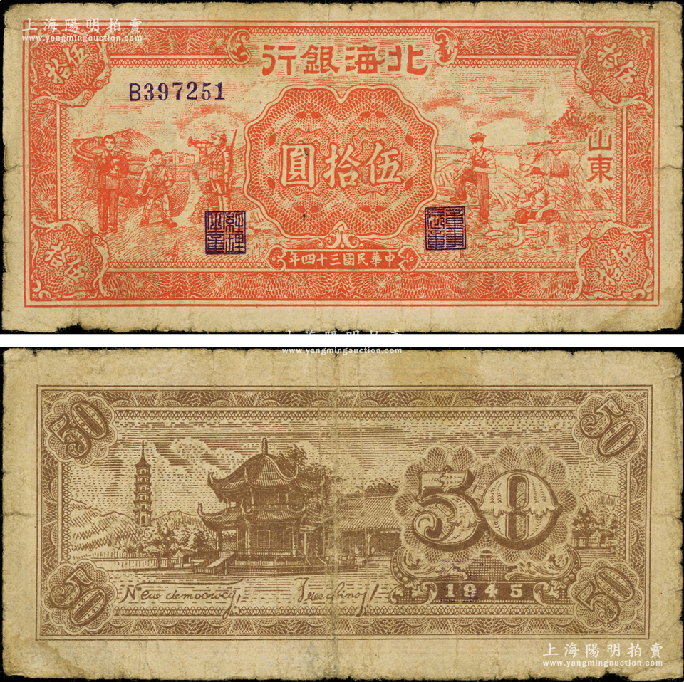 民国三十四年(1945年)北海银行红色工农兵学商图伍拾圆,山东地名,背印英文口号“New democracy Free China”(即“新民主自由中国”),且右边侧有水印;张勇先生藏品,少见,原票七成新
