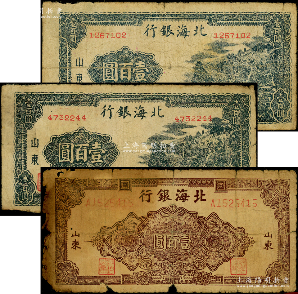 民国三十四年(1945年)北海银行纸币3枚,详分:棕色花纹图壹百圆1枚、蓝黑色右山景图壹百圆2枚(其中1枚内有大字英文水印);张勇先生藏品,原票五至七成新