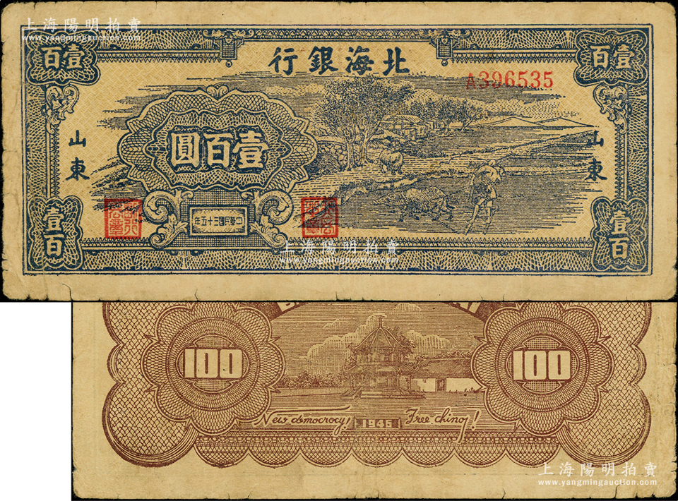 民国三十五年(1946年)北海银行蓝色牛耕地壹百圆,山东地名,背印英文口号“New democracy Free China”(即“新民主自由中国”);张勇先生藏品,少见,原票七成新