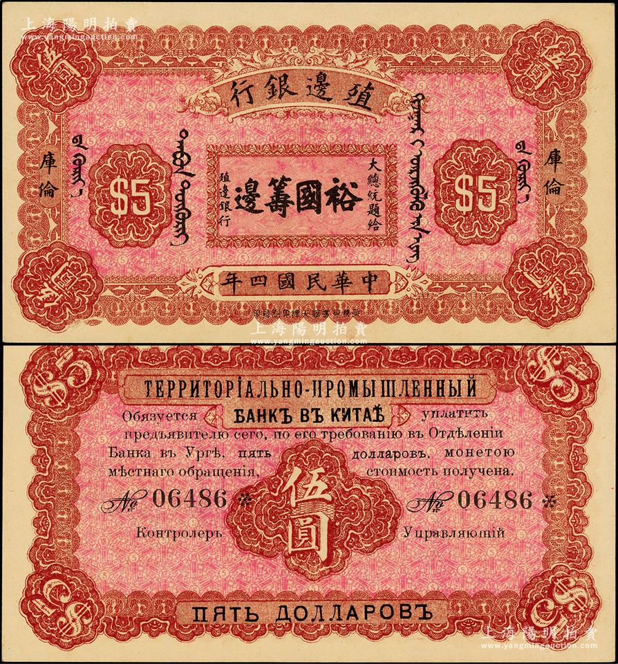 民国四年(1915年)殖边银行伍圆,库伦地名,上印大总统题字“裕国筹边”少见,九五成新