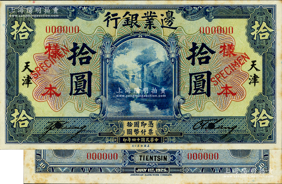 民国十四年(1925年)边业银行美钞版蓝色拾圆样本券,天津地名,正背共2枚,票上有英文签名,乃属国内银行之存档样本;源于日本名家森本勇先生之旧藏,罕见,未折九五成新
