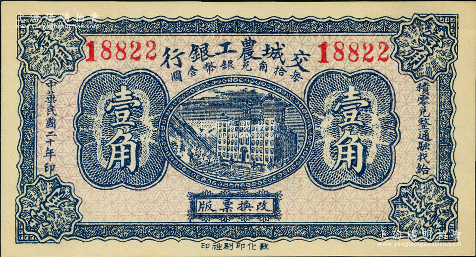 民国二十年(1931年)交城农工银行壹角,九八成新