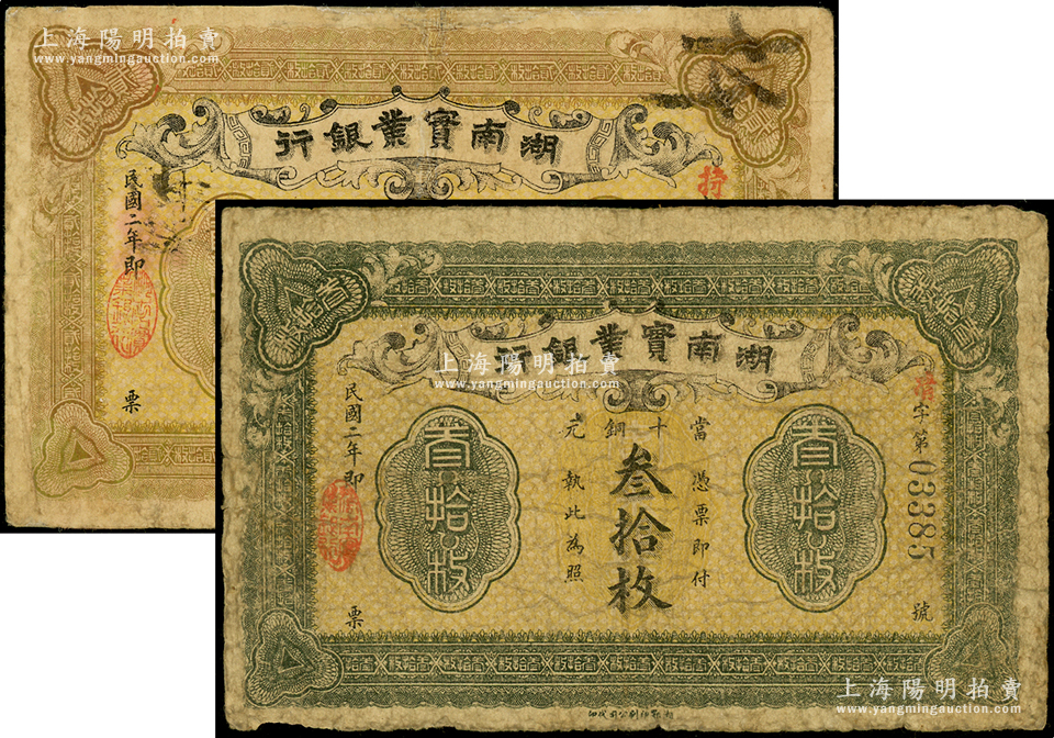 民国二年(1913年)湖南实业银行当十铜元贰拾枚、叁拾枚共2种不同,台湾藏家出品,其中1枚边有修补,七成新