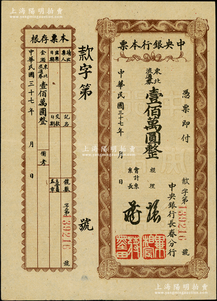 民国三十七年(1948年)中央银行本票(长春分行)东北流通券棕色壹佰万圆,附带有存根,少见,八五成新