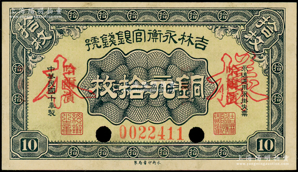 民国十年(1921年)吉林永衡官银钱号铜元拾枚,正票改作样本,哈尔滨地名;海外藏家出品,九五成新