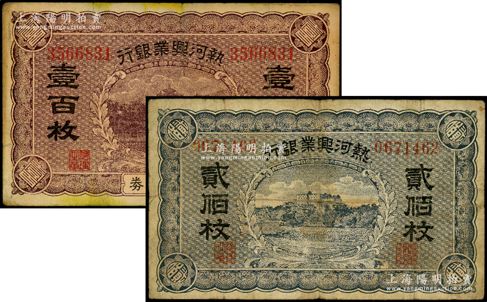 热河兴业银行铜元兑换券壹百枚、贰佰枚共2张不同,海外藏家出品,七至八成新