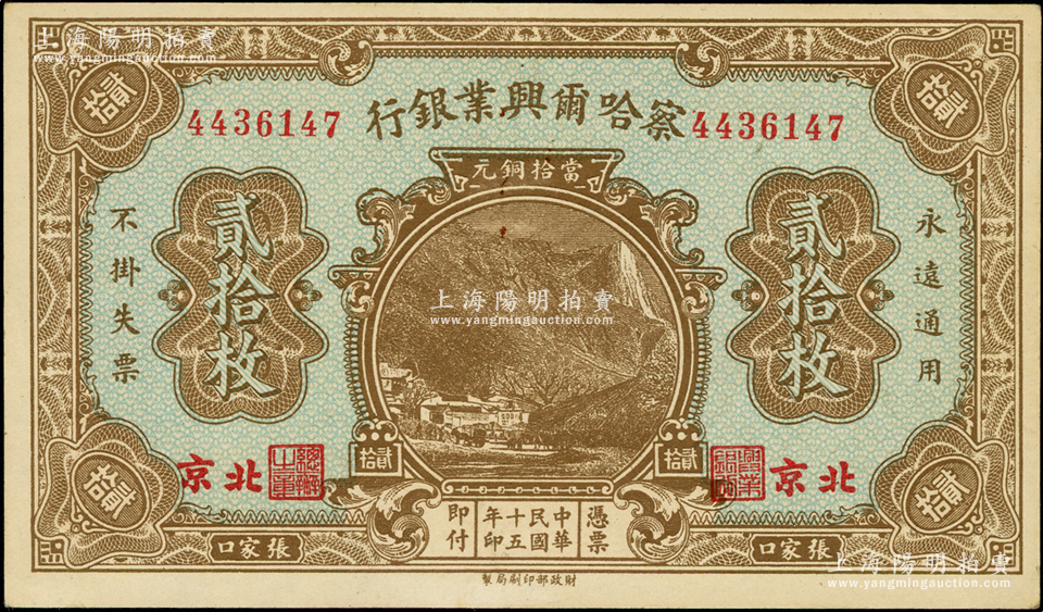 民国十五年(1926年)察哈尔兴业银行当拾铜元贰拾枚,北京·张家口地名,背印第一版Li En Ching英文签名,上佳品相,未折九五成新