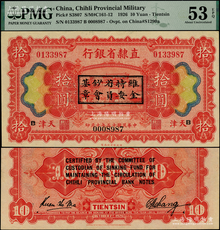 民国十五年(1926年)直隶省银行财政部版拾圆,天津地名,正背加印“维持省钞基金委员会章”和英文,且重新编号;江南藏家出品,罕见,PMG AU 53 EPQ