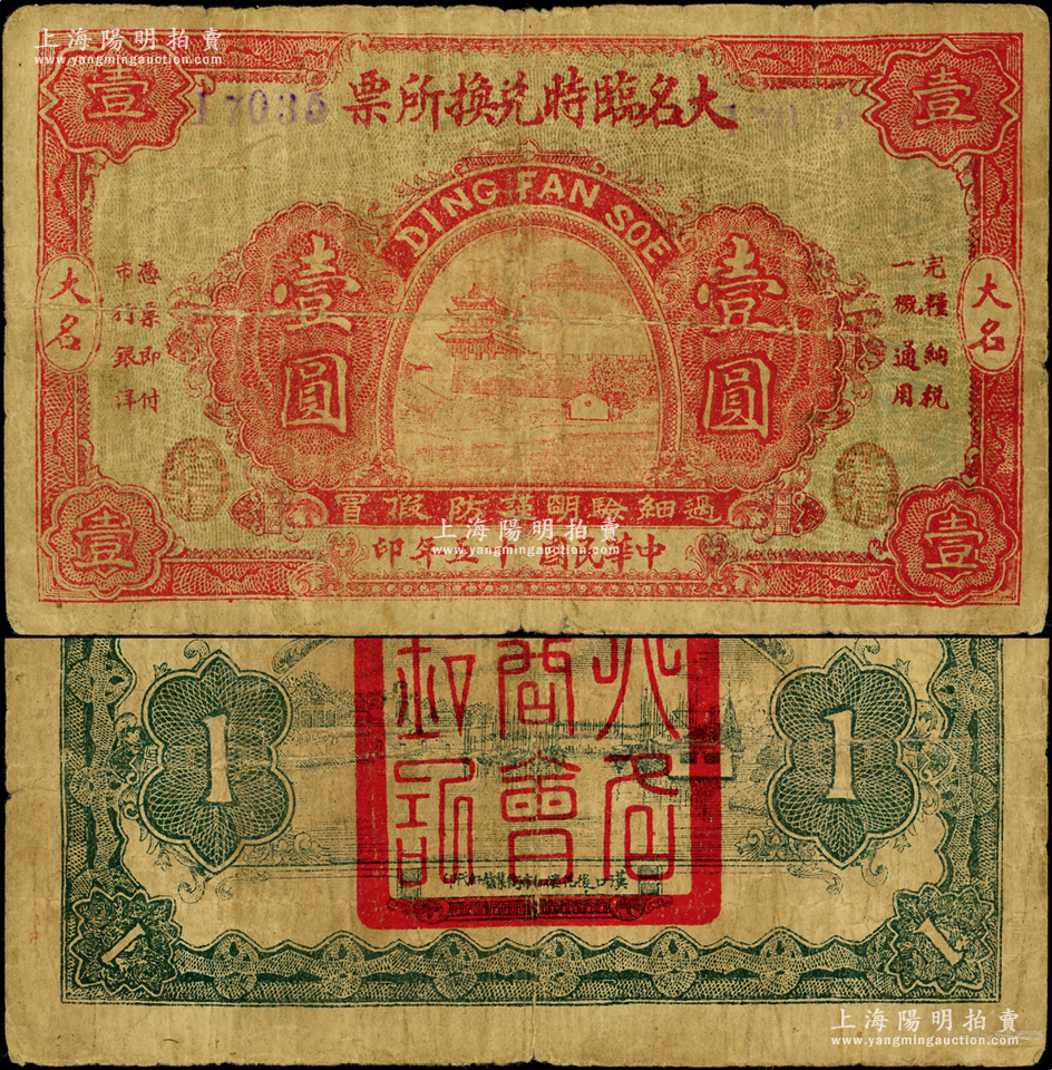 民国十五年(1926年)大名临时兑换所票壹圆,上印红色城楼图,背盖商会钤印;日本回流品,罕见且属首度公诸于阳明(注:阳明先前所拍者为1927年版紫色券),七成新