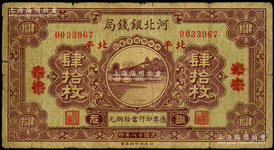 民国十八年(1929年)河北银钱局铜元肆拾枚,天津改北平地名,此乃京兆银钱局改组为河北银钱局之后的第一版纸币(其图案与后期年份者不同);海外藏家出品,少见,七成新