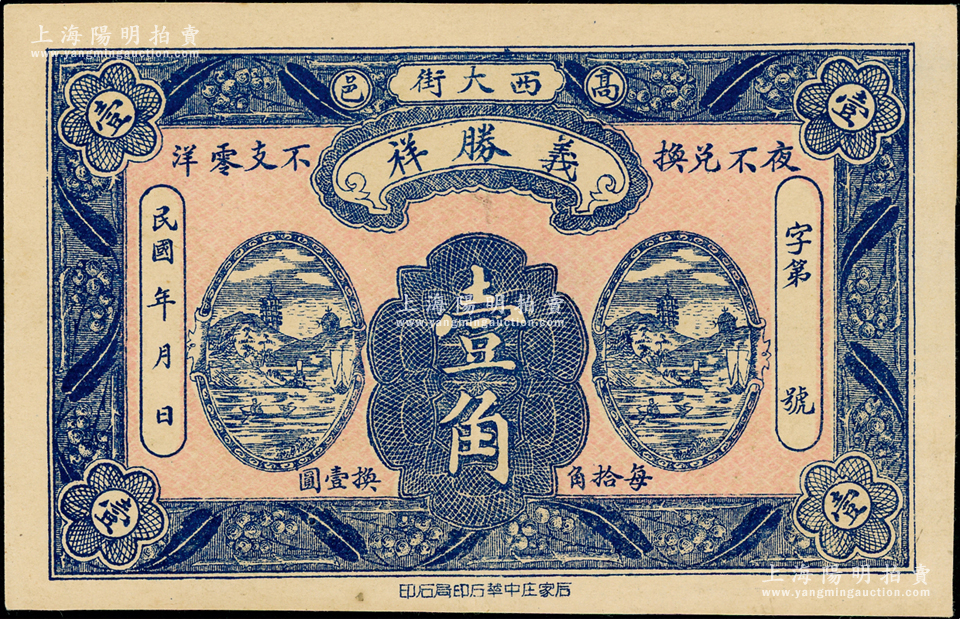 民国年河北(高邑)义胜祥壹角,上印山水风景图,背印雄鹰图;海外藏家出品,少见且属首度公诸于阳明,九成新