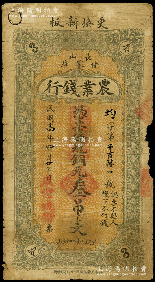 民国十四年(1925年)农业钱行铜元叁吊,属山东长山县钱庄钞票,少见且属首度公诸于阳明,近七成新