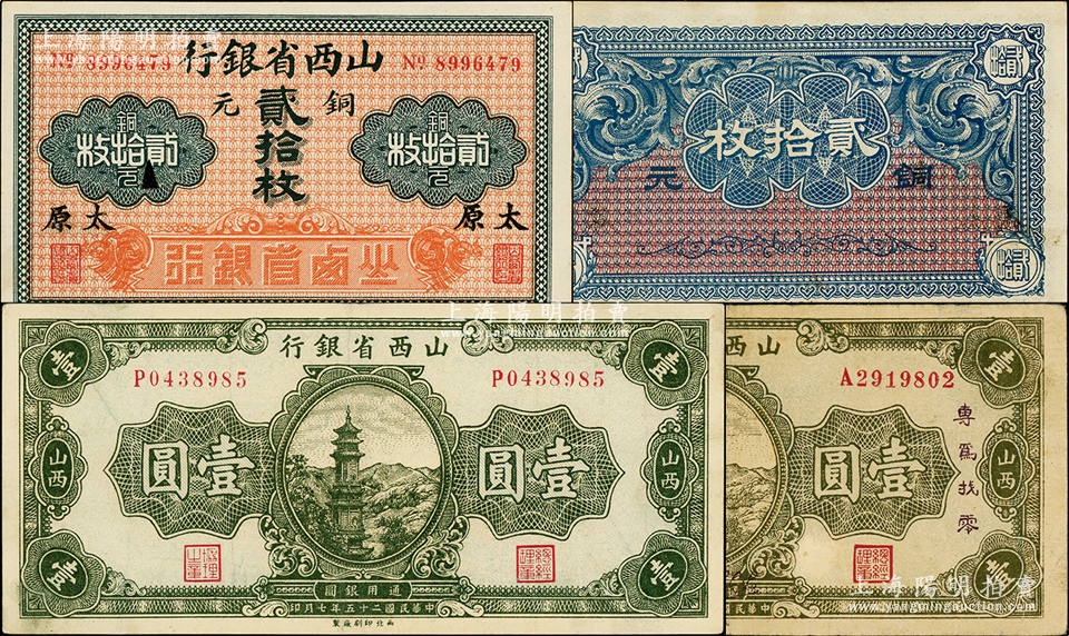 山西省银行纸币3种,详分:无年份太原贰拾枚,太原地名;1936年壹圆2种,其中1枚加印“专为找零,兑换法币”字样,原票八至九五成新