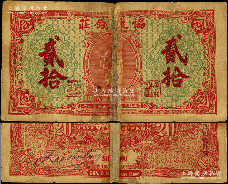 1922年(上海)协康钱庄铜圆贰拾枚,老上海钱庄轿饭票,上印天官赐福图,背印红色版(通常所见背面均为绿色),且又手盖“民国十七年贰月初壹日”发行日期;前辈藏家出品,少见,背有老式贴纸,近六成新