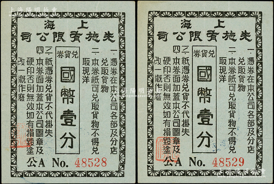上海先施有限公司兑货券国币壹分共2枚连号,冠字“公A No.”,此乃老上海四大百货公司之一,发行于孤岛时期;江南藏家出品,九成新