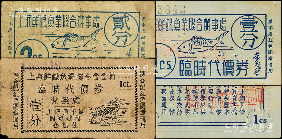 老上海鱼行业代价券3种,详分:上海鲜咸鱼业联合办事处临时代价券壹分、贰分,上海鲜咸鱼业联合会会员临时代价券壹分,其上均印有鱼图,颇为有趣;前辈藏家出品,七至近九成新