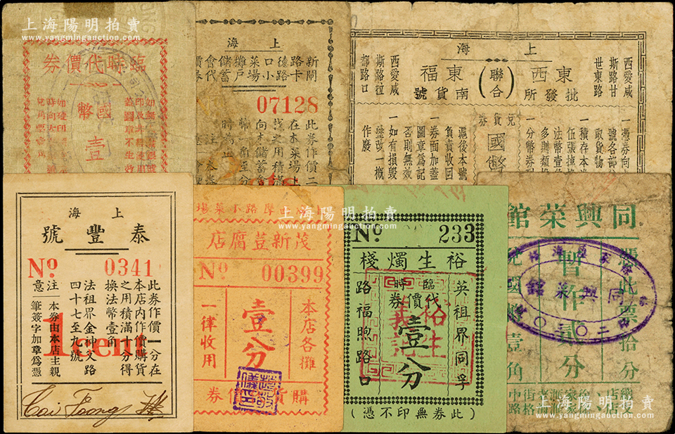 老上海代价券7种,详分:上海泰丰号1分,茂新豆腐店购货代价券壹分,裕生烛栈临时代价券壹分,同兴菜馆暂作贰分,大康银号临时代价券壹分,新闸路卡德路口小菜场摊户储蓄会代价券2分,东西批发所·东福南货号(联合)兑货券国币贰分;前辈藏家出品,六至八五成新