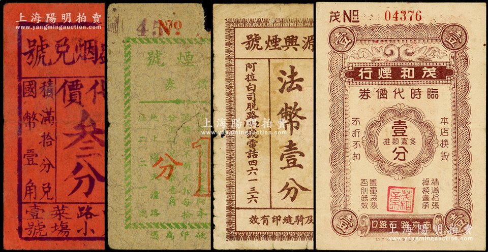 老上海烟号代价券4种,详分:立盛烟兑号代价叁分,泰兴烟号代价券壹分,泰源兴烟号货物代价券法币壹分,茂和烟行临时代价券壹分,六至八成新,敬请预览
