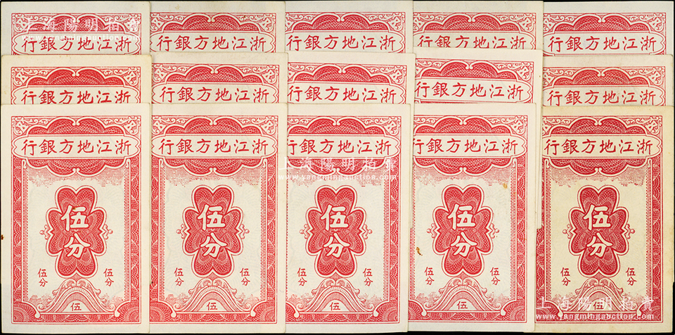 浙江地方银行竖式伍分共15枚,均属7位号券,部分连号,原票九至九八成新,敬请预览