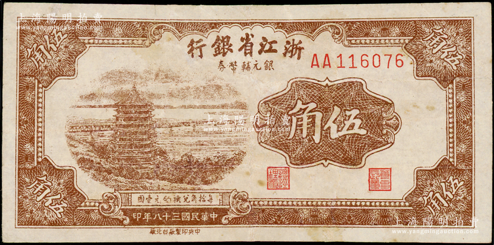 民国三十八年(1949年)浙江省银行银元辅币券伍角,AA字轨,发行流通于舟山群岛;江南藏家出品,八成新
