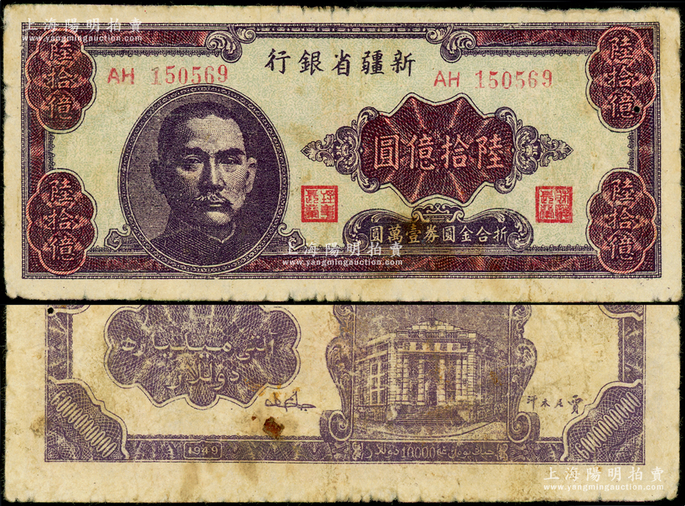 1949年新疆省银行陆拾亿圆,乃属中国纸币之最大面额券,前辈藏家出品,原票七五成新