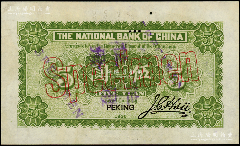 民国十九年(1930年)中华国家银行伍圆仅背面样本券,北京地名,属中原大战时期阎锡山氏发行;海外藏家出品,罕见,九五成新