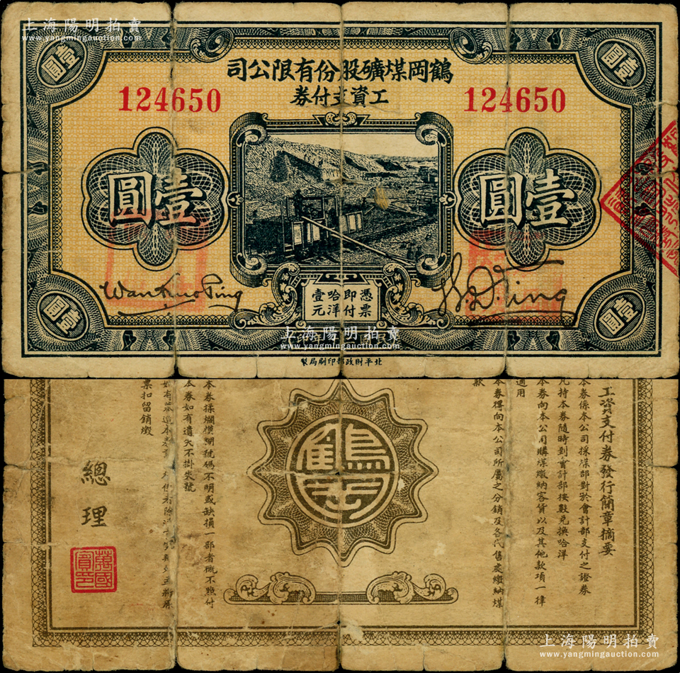 民国二十年(1931年)鹤岗煤矿股份有限公司工资支付券壹圆,背面总理万国宾乃东北边防军副司令长官、黑龙江省主席万福麟之子,曾与马占山共同抗日;此种流通票正面盖有“临时军用”和“鹤岗煤矿”红章者,已确定属东北义勇军所发行;海外藏家出品,少见,近七成新
