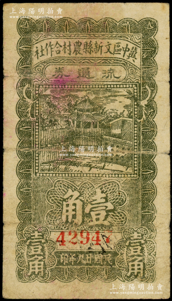 民国廿九年(1940年)冀中区文新县农村合作社流通券壹角,源于藏家出品,原票七成新