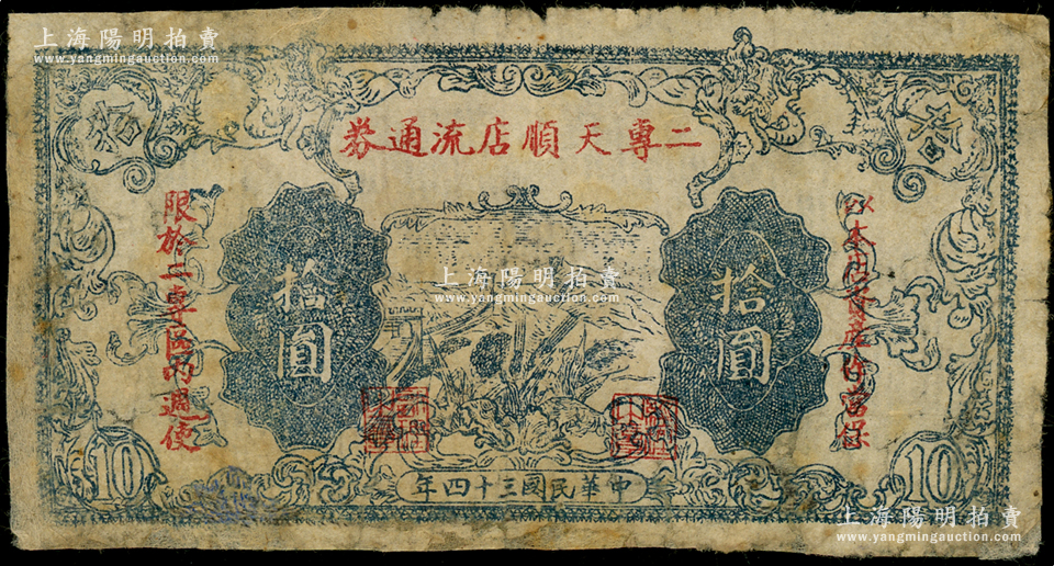 民国三十四年(1945年)二专天顺店流通券拾圆,印有“以本店资产作当保,限于二专区内週使”红字,其上长城图与晋察冀边区银行拾圆券相同;此乃晋察冀革命根据地纸币,流通于山西雁门关东北部;源于藏家出品,少见,有修补,七成新