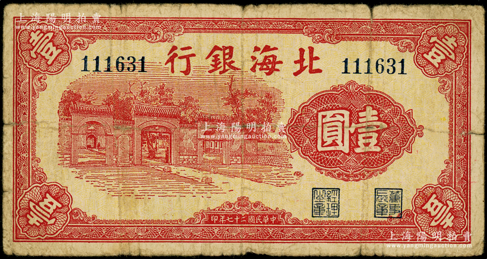 民国二十七年(1938年)北海银行红色壹圆,上印掖县政府大门图;源于藏家出品,少见,原票七成新