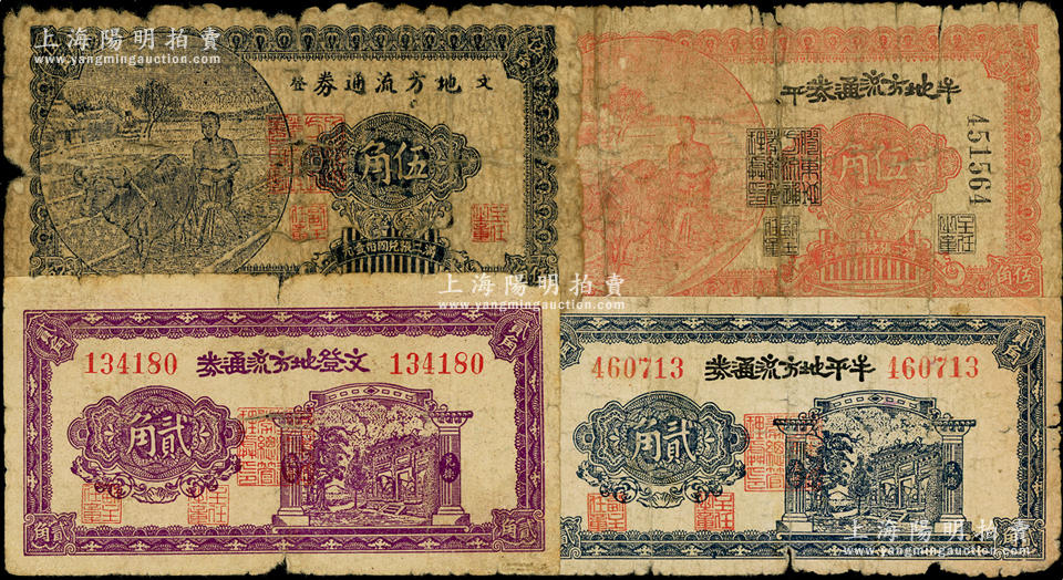 民国三十年(1941年)胶东解放区纸币4种,详分:牟平地方流通券贰角、伍角,文登地方流通券贰角、伍角,属北海银行之地方辅币;源于藏家出品,五至七成新,敬请预览