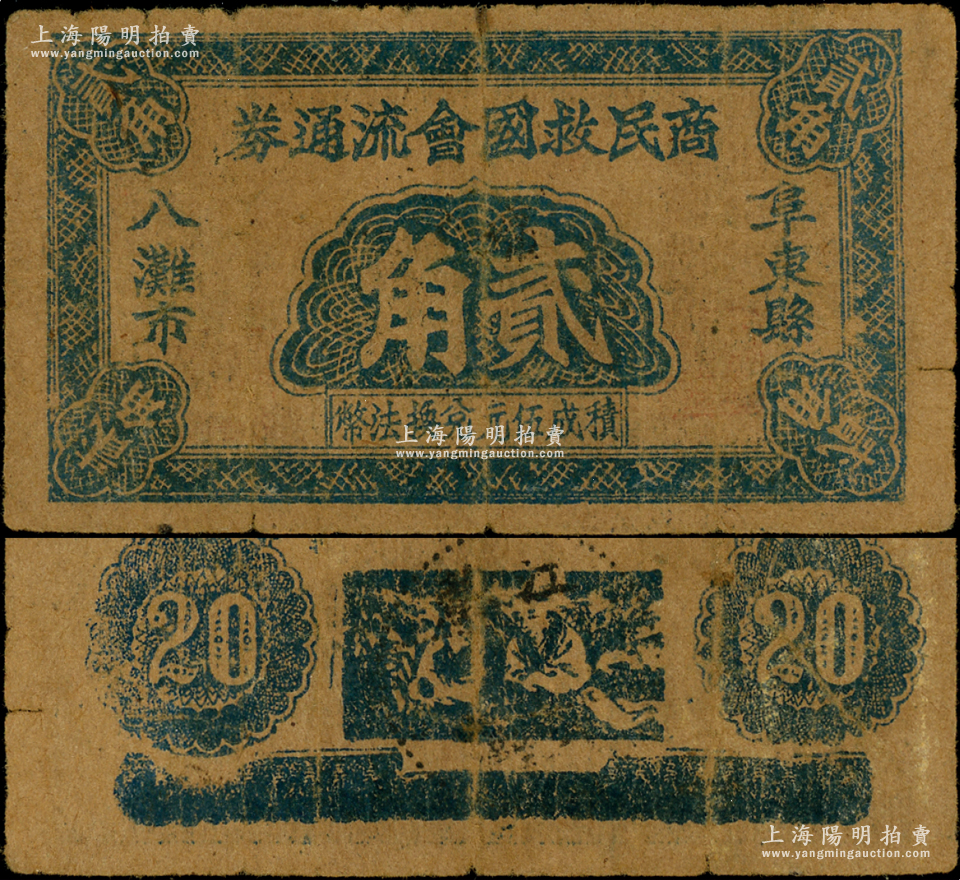 阜东县八滩市商民救国会流通券(1941年)贰角,背印和合二仙图,属盐城地区新四军抗币之珍罕品,未见图谱记载;源于藏家出品,乃首度公诸于阳明,诚可遇而不可求也,原票近八成新(注:阳明曾在2015年春森本勇先生专场中拍过1枚伍角券,其成交价为40250元!)