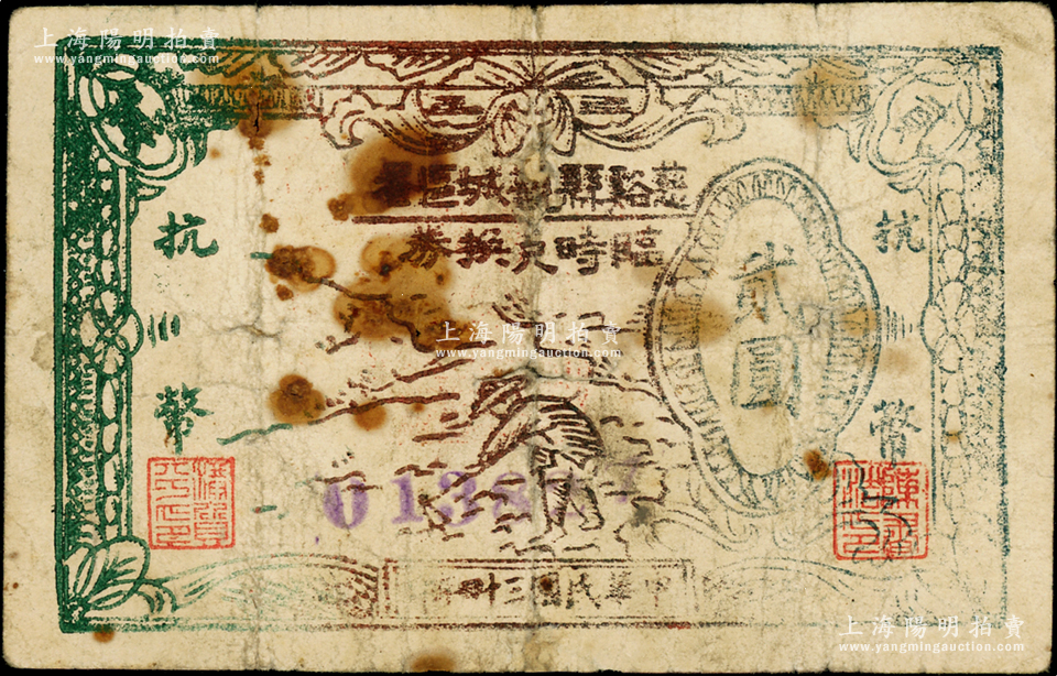 民国三十四年(1945年)慈谿县观城区署临时兑换券抗币贰圆,背盖官印,属新四军浙东抗日根据地纸币之珍罕品;源于藏家出品,乃首度公诸于阳明,诚可遇而不可求也,边有小修,七成新