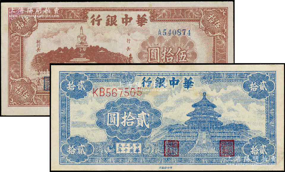 民国三十五年(1946年)华中银行蓝色天坛图贰拾圆、棕色北海图伍拾圆共2枚不同,源于藏家出品,有修补,七五成新