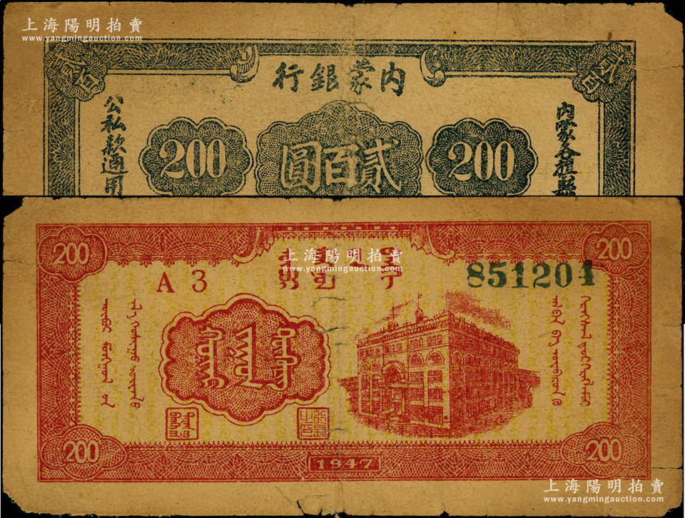 民国三十六年(1947年)内蒙银行贰百圆,宽体大号码版,源于藏家出品,原票七成新