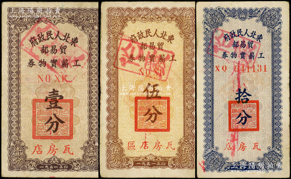 1951年东北人民政府贸易部工薪实物券壹分、伍分、拾分共3种,均为“瓦房店”地名;源于藏家出品,原票七至八成新