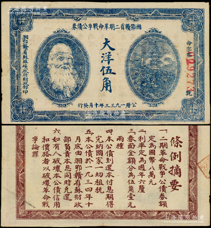 1933年湘鄂赣省二期革命战争公债券大洋伍角,上印马克思头像,少见,原票八成新