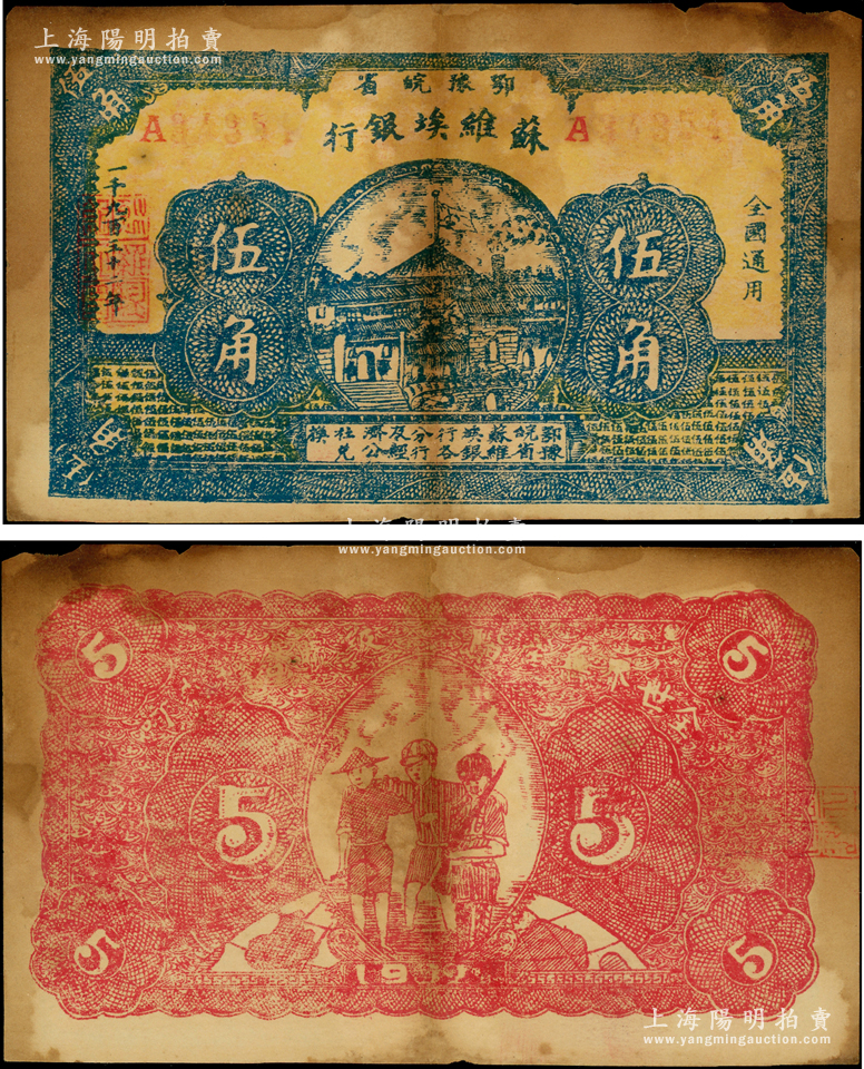 1932年鄂豫皖省苏维埃银行伍角,背印工农兵图,并有“全世界无产阶级联合起来呵”之口号;罕见品,且已属所见之较佳品相,有黄斑,仅一折,右上角边有微损,原票八成新
