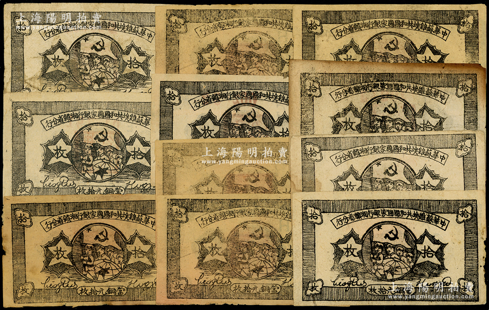 1934年中华苏维埃共和国国家银行湘赣省分行拾枚共11张,内含C字轨4张、E字轨1张、G和H字轨各3张,原票七至八成新,敬请预览
