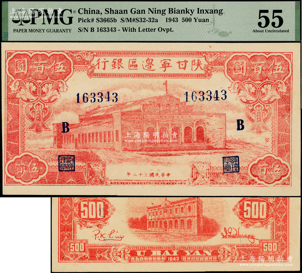 民国三十二年(1943年)陕甘宁边区银行红色大会堂图伍百圆,6位数大号码券,加印蓝色“B”字,且正面图案右侧印有“发”字;资深藏家出品,PMG 55 AU