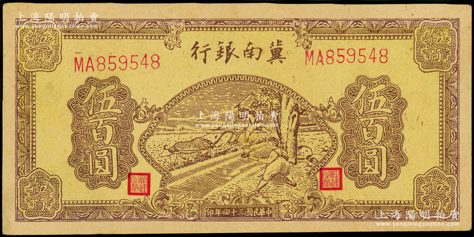 民国三十四年(1945年)冀南银行棕黄色牛耕地伍百圆,薄纸版;海外藏家出品,原票未折九五成新