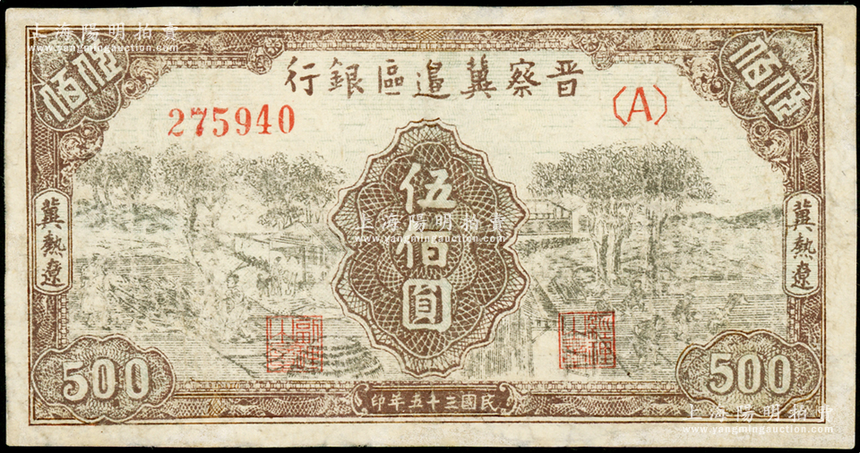 民国三十五年(1946年)晋察冀边区银行打场与锄地图伍佰圆,冀热辽地名,有修补,七成新