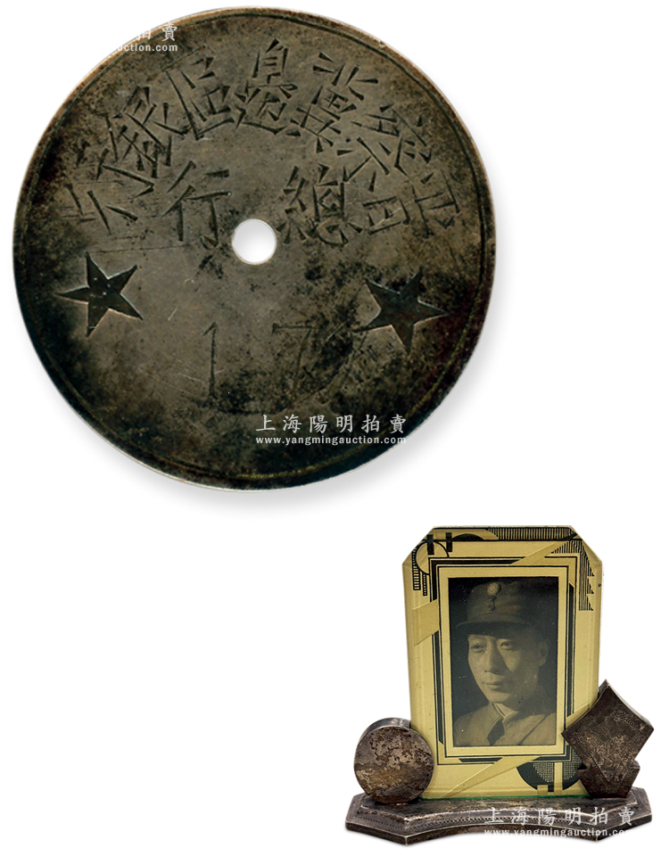 抗战时期“晋察冀边区银行总行”圆形银牌1枚,直径38mm,上刻五角星两颗,另附送银质底座相框(内含聂荣臻将军戎装像老照片1张)1个,底部有“杨庆和长记”款;珍罕,可适用于展览和典藏,保存甚佳,敬请预览和珍视