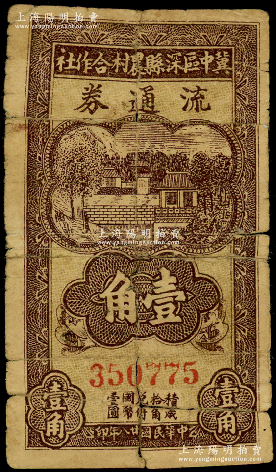 民国廿八年(1939年)冀中区深县农村合作社流通券壹角,资深藏家出品,有修补,六成新